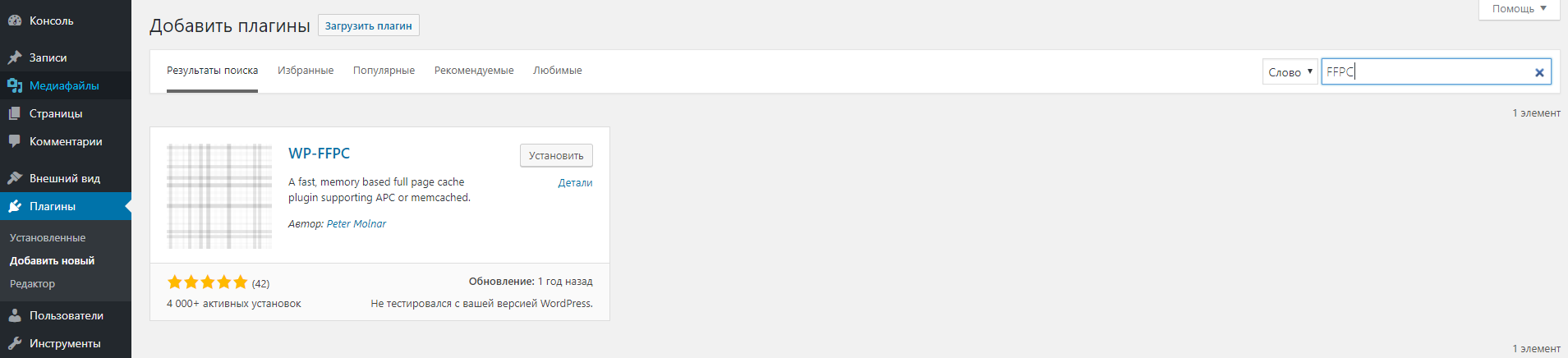 - Нажмите кнопку «Установить» напротив плагина «WP-FFPC».